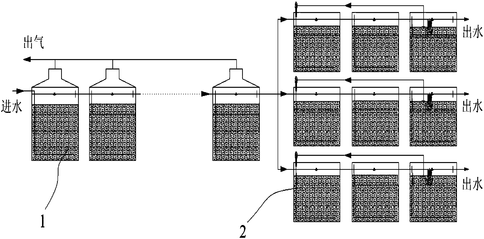 (2)本發明采用串聯式UASB厭氧反應塔使活性污泥與進水基質充分接觸的條件,充分發揮微生物對有機物的降解酸化能力,同時具有良好的污泥截留能力,能保證反應塔內足夠的生物量。以達到降解CODCr的目的。