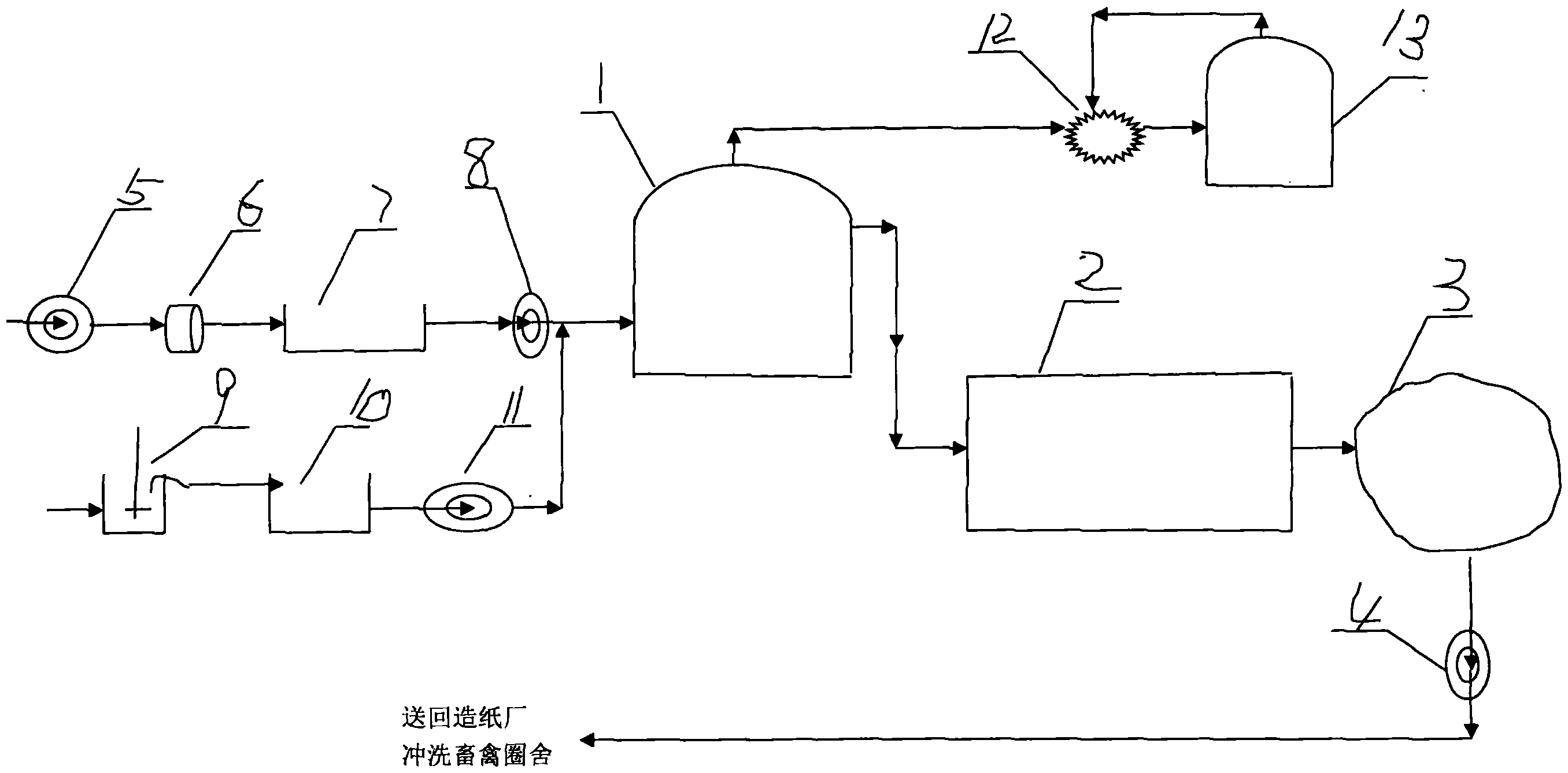 造紙廢水處理和養殖業糞便水處理結合的設施,由厭氧好氧集成裝置和濕地組成,造紙廢水和養殖業糞便水經厭氧好氧集成裝置處理,生成生態水,生態水通過管道流到濕地,濕地種植水生農作物,農作物根系吸收有機物達到凈化水質之目的。當水質達到沖洗網布標準,從濕地流到儲存池,用水泵把儲存池里的水抽出來,一是沖洗畜禽圈舍;二是送回紙廠用于打漿或沖洗網布,循環利用零排放。
