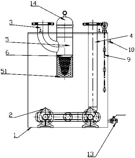 1.一種帶毛發過濾的污水提升裝置,包括集水箱(1)、排污泵(2)、進水管道(3)、排水管道(4)、過濾管(5);所述排污泵(2)連接排水管道(4);其特征在于:所述進水管道(3)上端連接污水源,下端連接過濾管(5);所述過濾管(5)一端伸出集水箱(1),并連接有上蓋(14),所述過濾管(5)另一端的外壁設有蜂窩狀出水孔(51),所述過濾管(5)內還可拆卸的設置毛發過濾袋(6)。