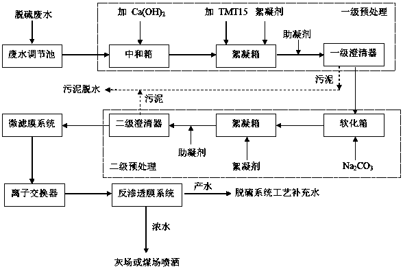 所述二級預處理用于將煙氣脫硫廢水中的鈣鎂離子轉變為難溶的化合物,并采用絮凝方法將沉淀物析出,實現廢水的深度軟化。