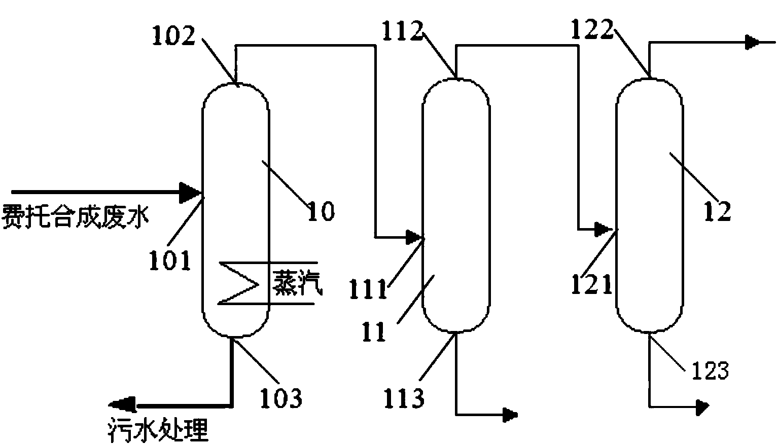 本發(fā)明另一方面提供了一種費托合成廢水的處理方法,包括:醇酸脫除過程:將費托合成廢水進行精餾,得到脫酸氣和蒸余液,脫酸氣包括乙酸與醇;第一堿洗過程:將脫酸氣在第一堿液中進行堿洗處理,得到第一乙酸鈉溶液和第一氣體;第二堿洗過程:將第一氣體在第二堿液中進行堿洗處理,得到第二乙酸鈉溶液和第二氣體。