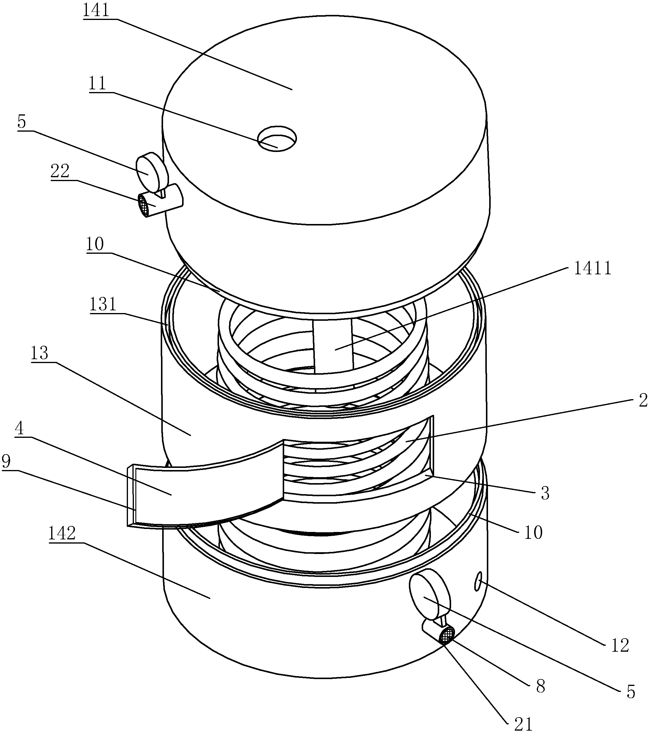 4.根據(jù)權(quán)利要求3所述的一種廢水余熱回收裝置,其特征在于:所述下固定部(142)上底面與上固定部(141)下底面均設(shè)有凸起(10),所述維修部(13)上下底面均設(shè)有圓形凹槽(131),所述凸起(10)與圓形凹槽(131)呈嵌設(shè)配合。