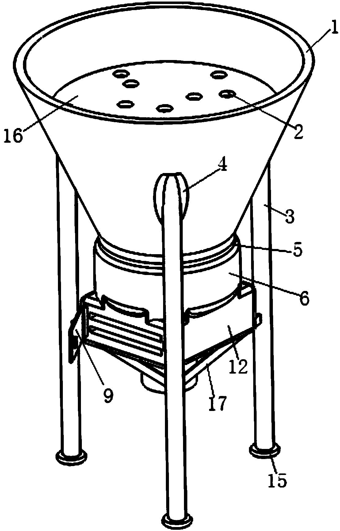 3.根據權利要求1所述的一種新型環保水處理裝置,其特征在于:所述的支柱(3)的一端設置有連接塊(4);所述的連接塊(4)的材質為鋼;所述的支柱(3)通過連接塊(4)與漏斗(1)的外側表面連接;所述的三根支柱(3)均勻成圓周排列;所述的兩根支柱(3)之間的中央位置連接有加固桿(17)。