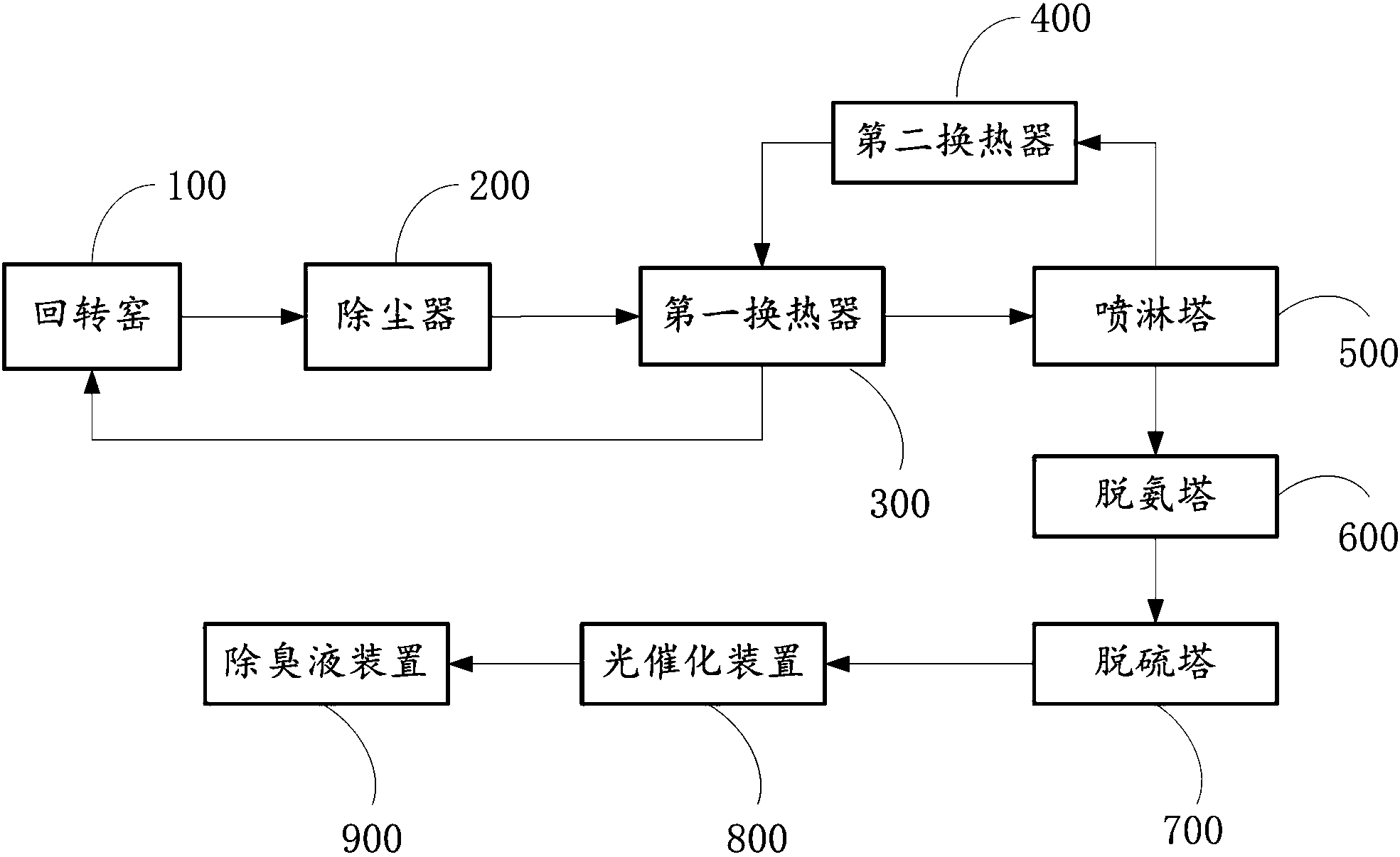 進一步地,所述換熱器包括連接于所述除塵器和噴淋塔之間的第一換熱器,以及連接于所述第一換熱器和噴淋塔之間的第二換熱器,且所述第二換熱器與所述回轉窯連通。
