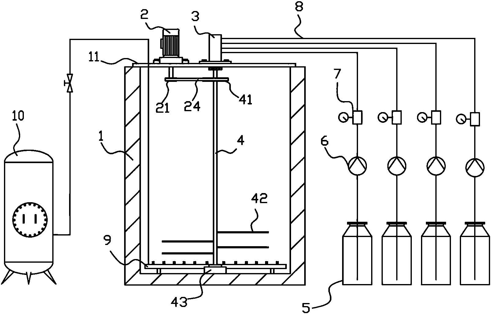 在反應(yīng)池外設(shè)有多個(gè)儲(chǔ)液罐(5),多個(gè)儲(chǔ)液罐(5)分別通過(guò)多根進(jìn)液管(8)連接在旋轉(zhuǎn)接頭(3)的多個(gè)進(jìn)液口(31)上,在進(jìn)液管(8)上安裝有計(jì)量泵(6)和流量計(jì)(7);
