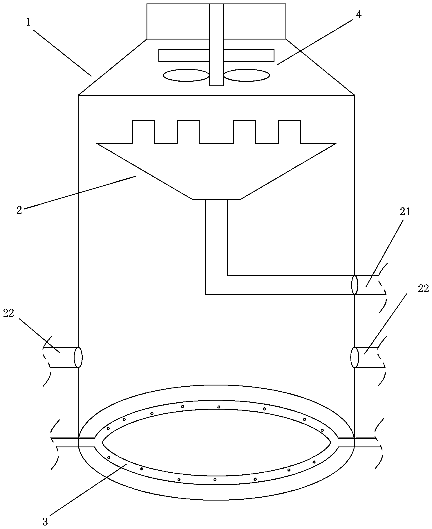 本實用新型的有益效果是:本裝置能夠將有效對污泥中的油水混合雜質等進行分離,其分離效率高,分離效果好,具有很好的使用價值;本裝置能有效消除反應過程中產生的氣泡,防止溢流;本裝置的輸氣/液管能使混入的氣/液與污泥反應液充分混合,實現能源的節省。