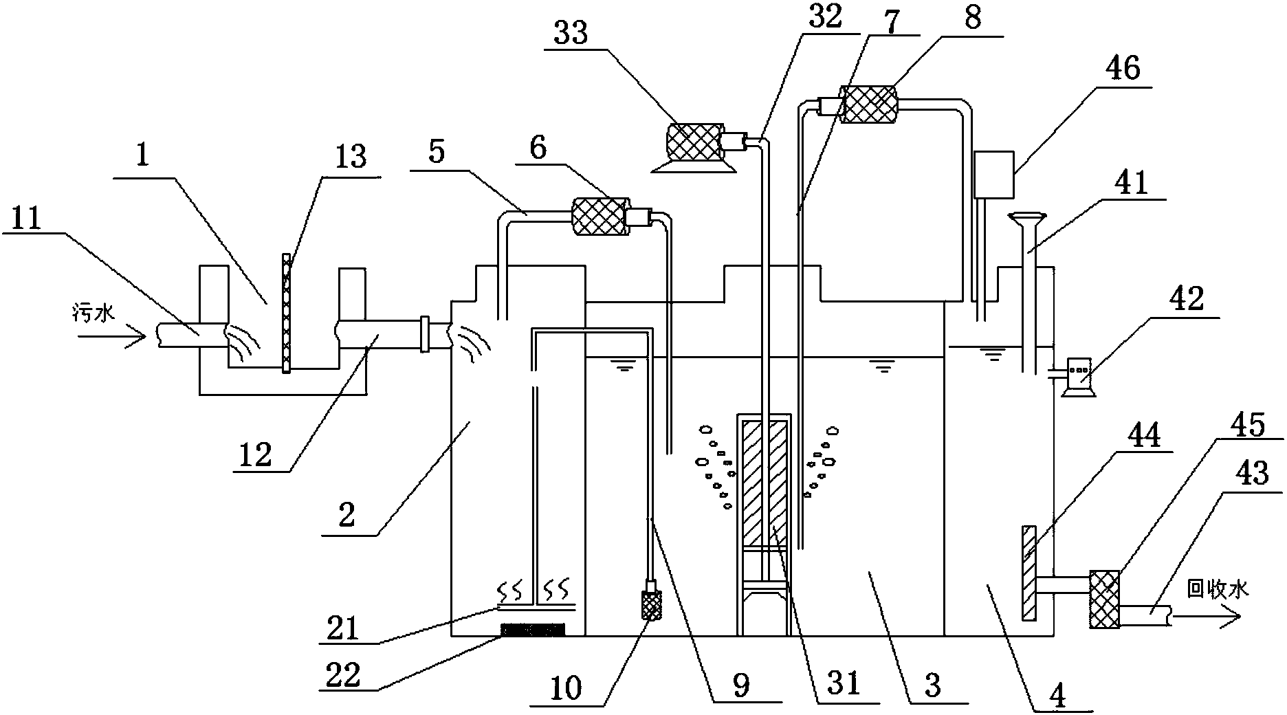 3.根據(jù)權(quán)利要求1所述的能夠消毒除臭的污水處理裝置,其特征在于:所述回收出水口設(shè)置有活性炭過(guò)濾器和反沖洗過(guò)濾器,所述活性炭過(guò)濾器設(shè)置在所述消毒除臭池內(nèi)部,所述反沖洗過(guò)濾器設(shè)置在所述消毒除臭池的外部。