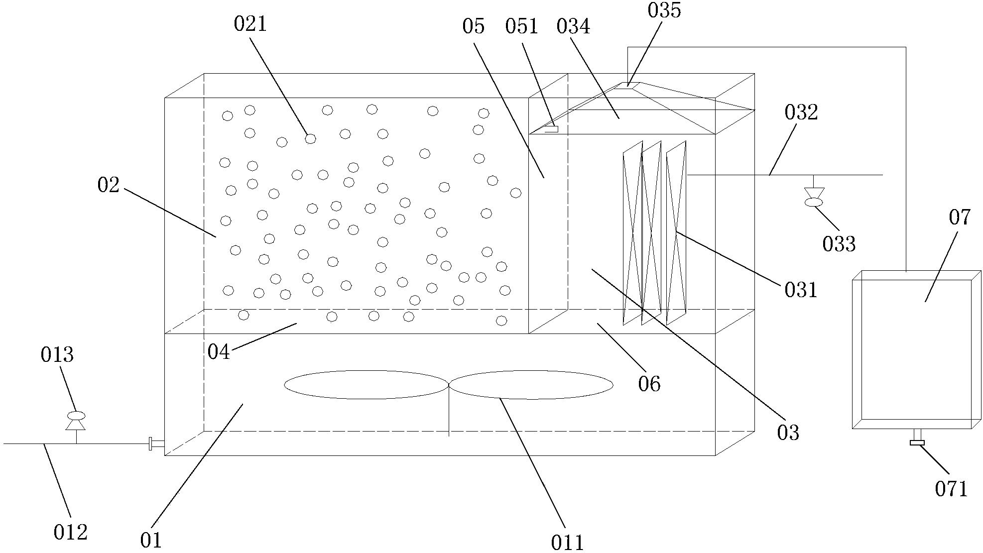 所述MBR膜系統間內部設置有MBR膜組件,所述MBR膜組件與穿過裝置側壁進入MBR膜系統間的污水出水管相連,所述污水出水管上設置有出水水泵,所述MBR膜系統間上部設置有氣水分離器,所述氣水分離器與所述氣水出口相連通,所述氣水分離器頂部設置有出氣口,底部設置有出水口。