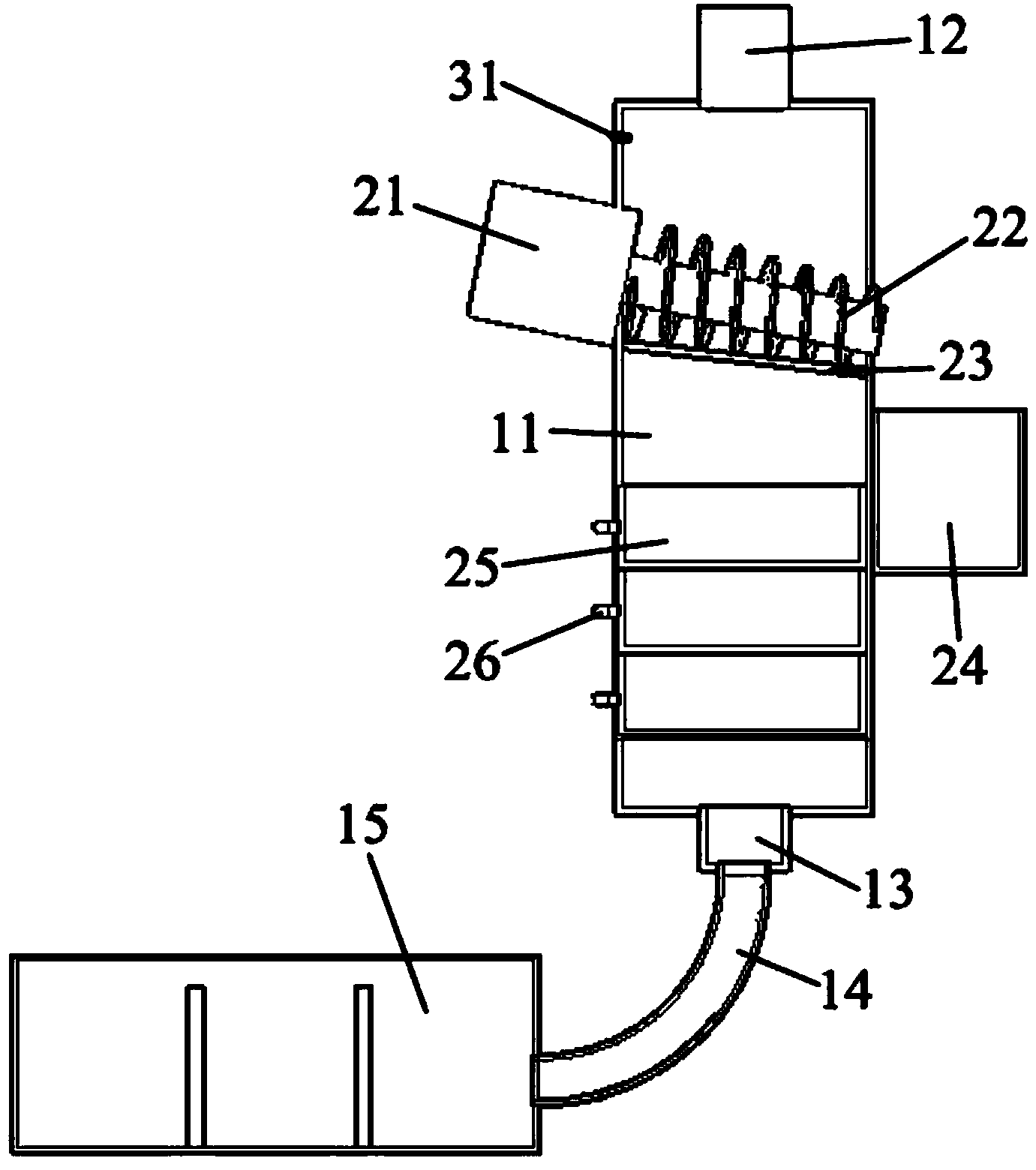 1.一種簡易生活污水處理裝置,包括過濾桶(11)、過水管道(14)、沉淀箱(15),其特征在于:所述過濾桶(11)頂部設置有進水口(12)、底部設置有出水口(13),出水口(13)通過過水管道(14)連通至沉淀箱(15)下部;所述過濾桶(11)內上部傾斜向下設置有推送器(22),推送器(22)為前小后大的螺旋葉軸,推送器(22)后端固定在電機(21)的動力輸出軸上、前端伸出出水口(13)外,出水口(13)外側于電機(21)端部下方位置設置有可拆卸的廢料桶(24);出水口(13)內于推送器(22)下方位置固定有過濾網(23);所述出水口(13)中下部設置有多層過濾箱(25);所述過濾桶(11)內于進水口(12)下方位置設置有光感傳感器(31),光感傳感器(31)正對進水口(12)位置,并通過串聯延時繼電器控制電機(21)啟停。