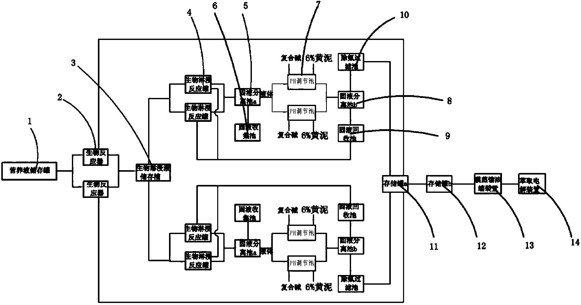 (5)將步驟(4)中的PH調節池中加入復合堿和6%黃泥,調節生物淋浸液的PH值,去除大量的F離子;