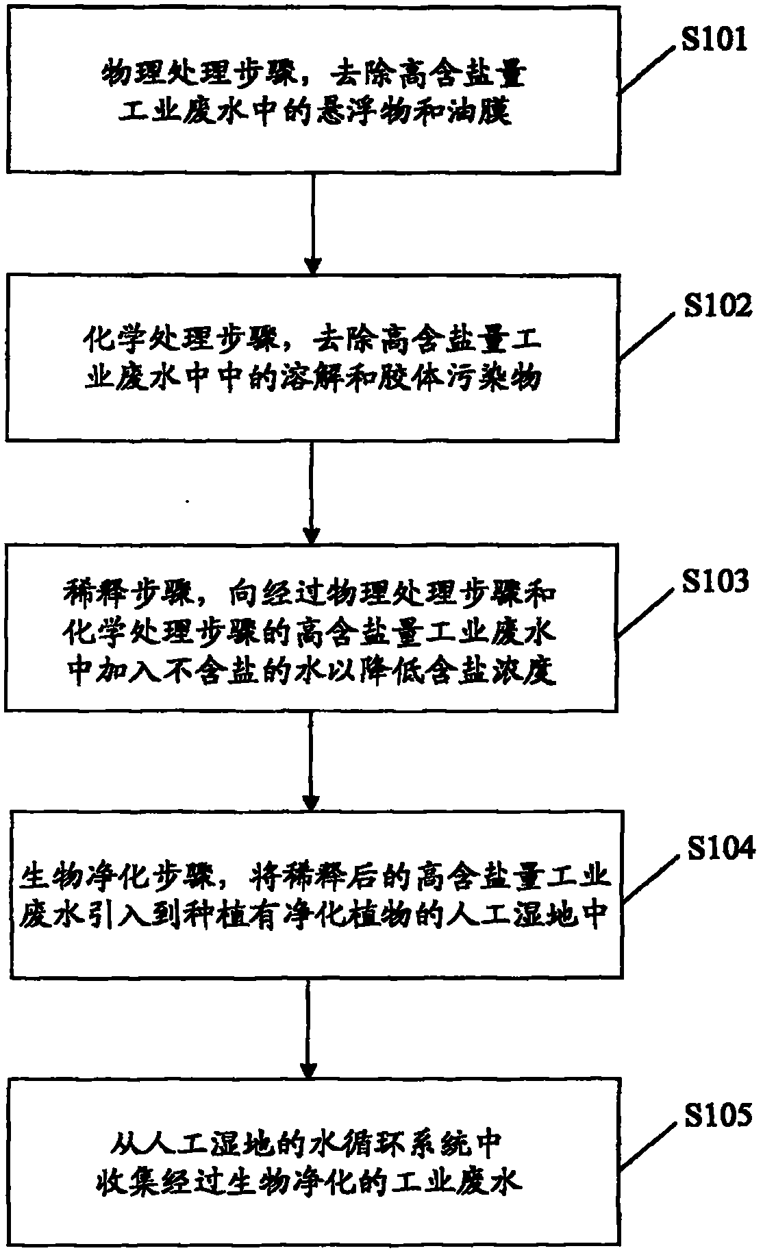 1.一種工業廢水的生物凈化處理方法,其特征在于,包括:物理處理步驟,去除高含鹽量工業廢水中的懸浮物和油膜;化學處理步驟,去除高含鹽量工業廢水中中的溶解和膠體污染物;稀釋步驟,向經過物理處理步驟和化學處理步驟的高含鹽量工業廢水中加入不含鹽的水,以降低含鹽濃度;生物凈化步驟,將稀釋后的高含鹽量工業廢水引入到種植有凈化植物的人工濕地中;從人工濕地的水循環系統中收集經過生物凈化的工業廢水。