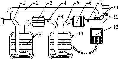 1.一種污泥處理用氣體凈化裝置,包括進氣道(1),其特征在于:所述進氣道(1)伸入到水池(8)的內部,所述水池(8)的頂部和連接管道(9)固定連通,所述連接管道(9)中部固定設有第一干燥裝置(3),所述連接管道(9)內部固定設有第一多成分氣體檢測儀(4),所述連接管道(9)伸入到有機溶劑池(10)中,所述有機溶劑池(10)頂部和出氣道(5)固定連通,所述出氣道(5)的中部從左到右依次固定設有第二干燥裝置(6)、第二多成分氣體檢測儀(7)和第二電磁閥(12),所述出氣道(5)和進氣道(1)之間通過循環管道(2)相互連通,所述循環管道(2)內部固定設有第一電磁閥(11),所述第一多成分氣體檢測儀(4)、第二多成分氣體檢測儀(7)、第一電磁閥(11)和第二電磁閥(12)分別通過導線和PLC控制器(13)電性連接。