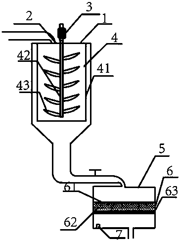 1.一種旋轉水處理裝置,其特征在于:包括處理塔與過濾箱;所述處理塔上表面設有廢水入口;所述處理塔由圓柱結構與漏斗結構組成;所述圓柱結構上端閉合,下端與漏斗結構結合;所述圓柱結構上表面外側設有電機;所述圓柱結構內部設有支架;所述支架上端安裝在圓柱結構上表面內側,下端為整體結構,支架上端與下端之間設置支撐板;所述支架內部設有帶有葉片的轉軸;所述轉軸穿過圓柱結構上表面與電機連接;所述葉片表面設有吸附膜;所述吸附膜由多孔纖維編織而成;所述過濾箱上表面設有廢水入口,內部設有過濾板,底部設有臭氧入口;所述過濾板由圍網以及設于圍網內部的石英砂層與水滑石層組成;所述石英砂層位于水滑石層上方;所述石英砂層的厚度為30厘米;所述處理塔通過漏斗結構直接連通過濾箱的廢水入口,使得廢水先進入處理塔后再進入過濾箱。