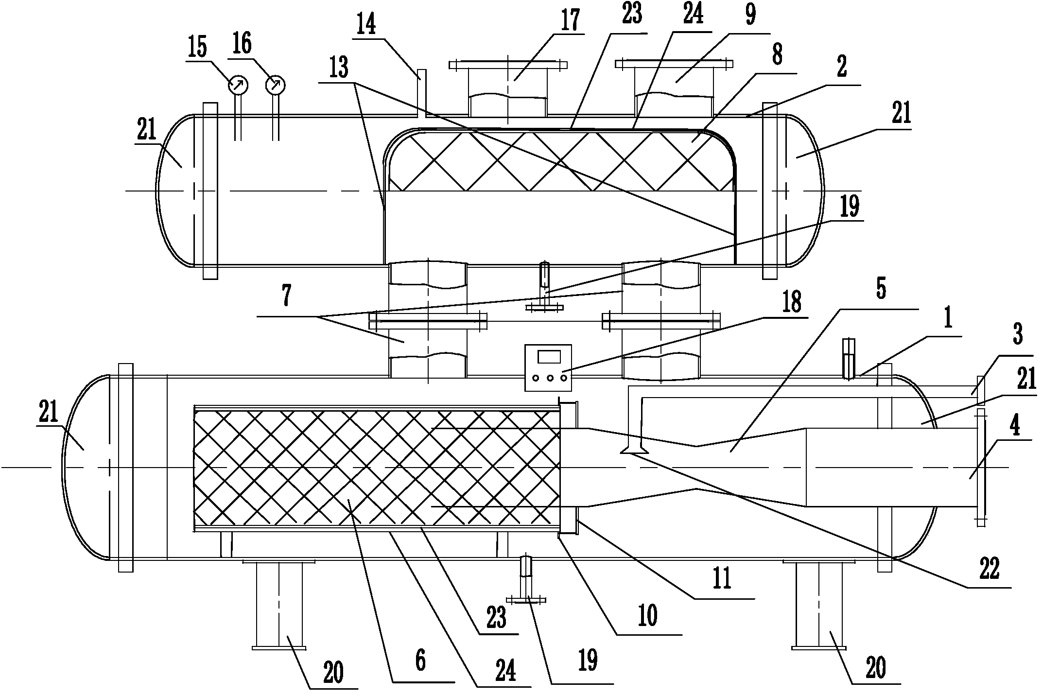 10.如權利要求1所述的一種鍋爐排污廢水焓差補償擴容凈化回收裝置,其特征在于,所述的混合過濾罐(1)上安裝有支撐腳(20);所述的混合過濾罐(1)和精密過濾罐(2)罐體兩端分別通過法蘭與端蓋(21)相連。
