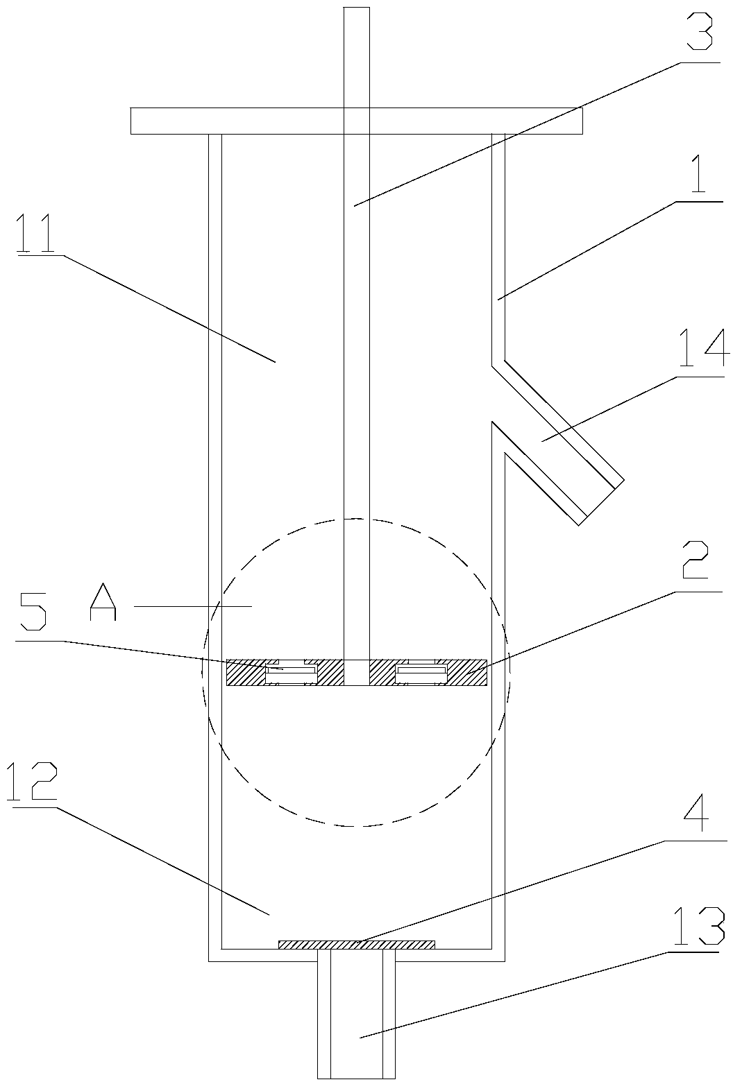 所述進水管(13)管口處設有一單向止水底閥(4),所述單向止水底閥(4) 控制廢水僅從低位水池流向B腔室(12);所述活塞(2)上設有若干連通A腔 室(11)和B腔室(12)的通道(21),各通道(21)上設有單向止水閥片(5), 所述單向止水閥片(5)控制廢水僅從B腔室(12)流向A腔室(11)。