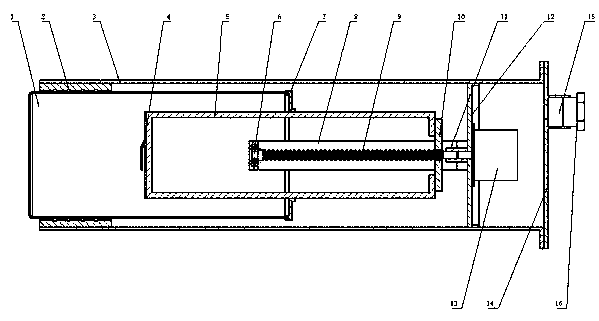 1.一種污水廠氧化溝水下圖像檢測設備防護裝置,其特征在于,包括一端開口的殼體(3);所述殼體(3)內安裝有驅動裝置(13);所述驅動裝置(13)驅動安裝在靠近所述殼體(3)開口一端內的移動支架(5)沿所述殼體(3)軸線方向移動;所述移動支架(5)遠離所述驅動裝置(13)的一端設置在能隨所述移動支架(5)移動的透明罩(1)內,且所述透明罩(1)內的移動支架(5)上固定有安裝支架(4);所述殼體(3)開口端與所述透明罩(1)之間密封連接。