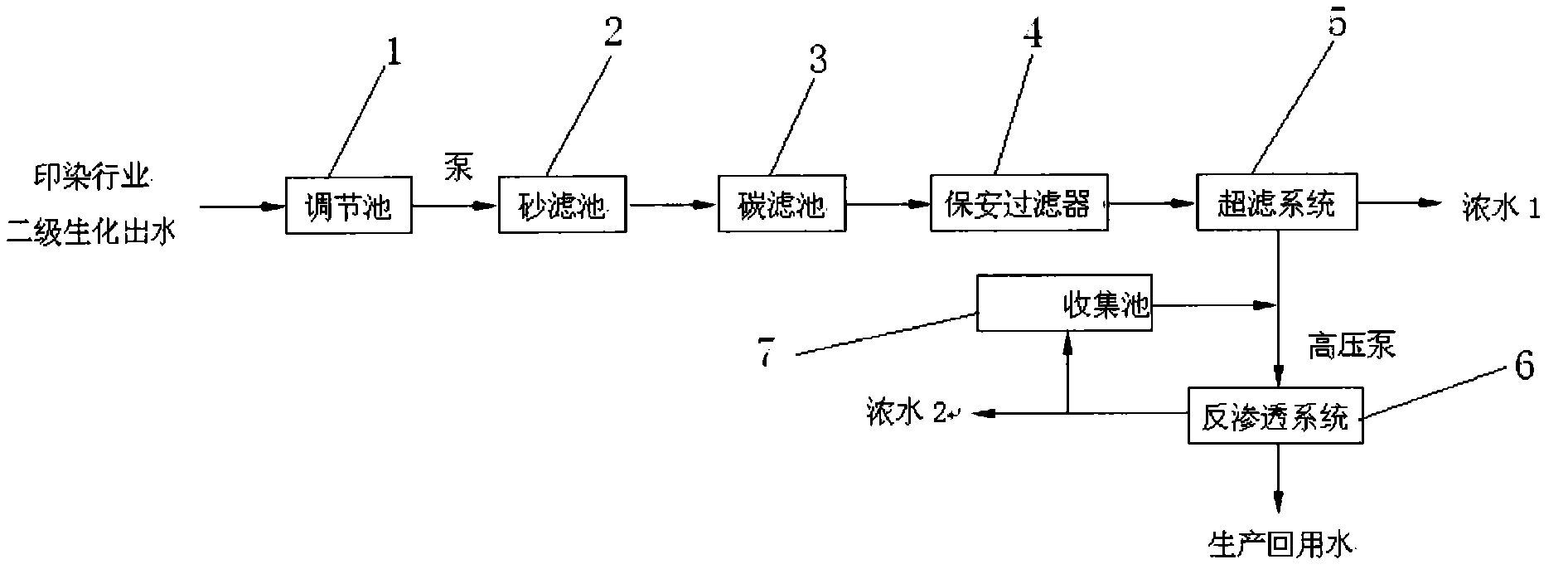 所述調節池通過泵連接砂濾池,所述砂濾池連接碳濾池,碳濾池連接保安過濾器,保安過濾器連接超濾系統,超濾系統通過高壓泵連接反滲透系統,反滲透系統連接收集池。