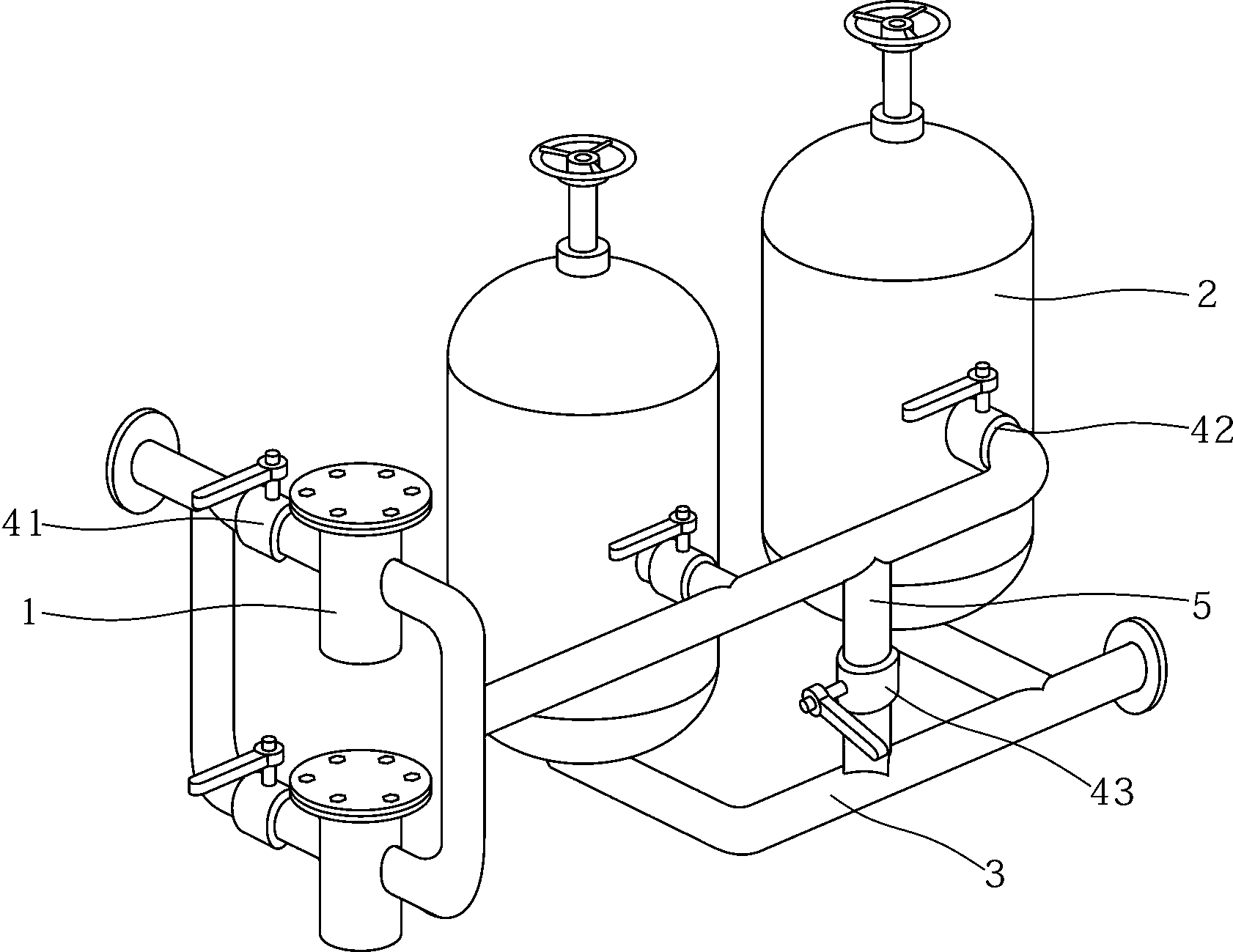 1.壓井液水處理裝置,它包括兩個籃式過濾器(1)、兩個精密過濾器(2)和相互連接的管路以及管路上安裝的閥門組成,其特征在于:所述的兩個籃式過濾器(1)并聯連接,兩個精密過濾器(2)并聯連接;所述的兩籃式過濾器(1)的輸出端通過管道連接到兩精密過濾器(2)的輸入端,所述的兩精密過濾器(2)的輸出端均連接到出水管路(3);兩籃式過濾器(1)的輸入端分別設有籃式過濾器閥門(41),兩精密過濾器(2)的輸入端分別設有精密過濾器閥門(42)。