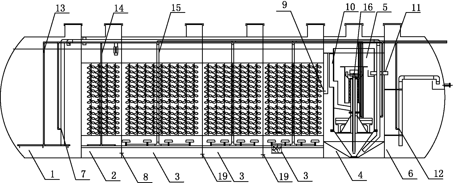 二沉池(4)與砂濾器(5)通過砂濾導流槽(10)連通,砂濾器(5)與清水池(6)通過清水管(11)連通,清水池(6)內設置有清水池氣提管(12)。