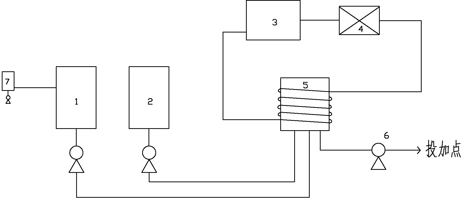 1.一種污水高效無氯消毒殺菌系統,其特征是它包括甲酸貯存箱(1)、雙氧水貯存箱(2)、反應箱(5)和投加計量泵(6),所述的投加計量泵(6)的輸入端接反應箱(5)的輸出端,投加計量泵(6)的輸出端以5-40PPM的劑量將反應箱生成的過氧甲酸通過水管混入污水進口端中,過氧甲酸快速溶入污水中在60秒內完成消毒殺菌并快速分解為水和二氧化碳,所述的反應箱(5)的輸入端接甲酸貯存箱(1)和雙氧水貯存箱(2)的輸出端。