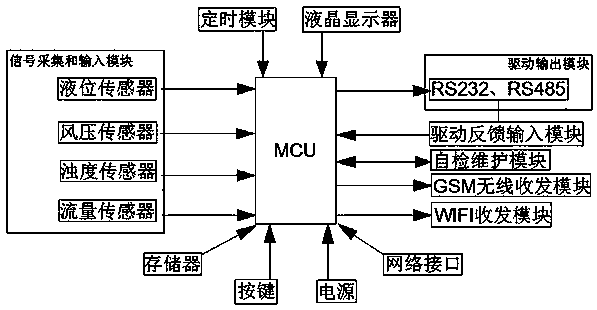 1.一種污水處理控制器,其特征在于,包括MCU,MCU配置有采集液位、風(fēng)壓、濁度和流量數(shù)據(jù)的信號采集和輸入模塊;MCU配置有作為驅(qū)動輸出模塊輸出端的RS232接口和RS485接口,RS232接口和RS485接口連接有用于反饋控制信息的驅(qū)動反饋輸入模塊,驅(qū)動反饋輸入模塊連接于MCU;MCU配置有通過驅(qū)動反饋輸入模塊反饋的控制信息進(jìn)行自檢和維護(hù)的自檢維護(hù)模塊,MCU同時配置有定時模塊、GSM無線收發(fā)模塊、連接互聯(lián)網(wǎng)的網(wǎng)絡(luò)接口、按鍵以及用于供電的電源。