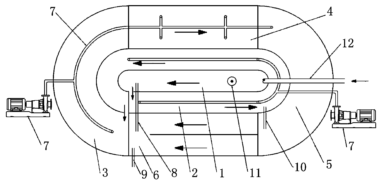 8.根據(jù)權(quán)利要求7所述的一種高寒地區(qū)生活污水處理工藝的裝置,其特征在于,所述氧化溝為環(huán)形,該厭氧區(qū)(1)設(shè)置在氧化溝的中心部位,缺氧區(qū)(2)環(huán)繞設(shè)置在厭氧區(qū)(1)一周,一段好氧區(qū)(3)、填料區(qū)(4)、二段好氧區(qū)(5)和沉淀區(qū)(6)則圍繞缺氧區(qū)(2)一周設(shè)置。
