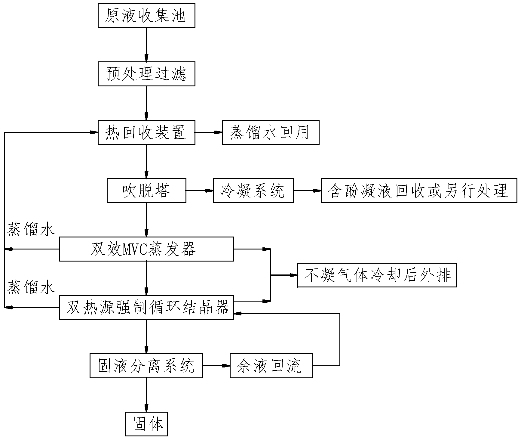 步驟六,將經過步驟五得到的焦化廢水原液送入固液分離系統,其中, 固體析出,余液送入步驟五中的雙熱源強制循環結晶器再次進行濃縮結晶蒸 干;