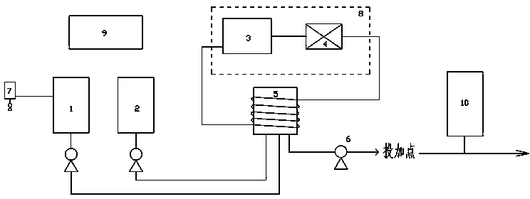 一投加計量泵(6),該投加計量泵(6)用于將反應箱(5)中生成的過氧甲酸按工藝規程的要求和劑量泵送到待處理的污水中;