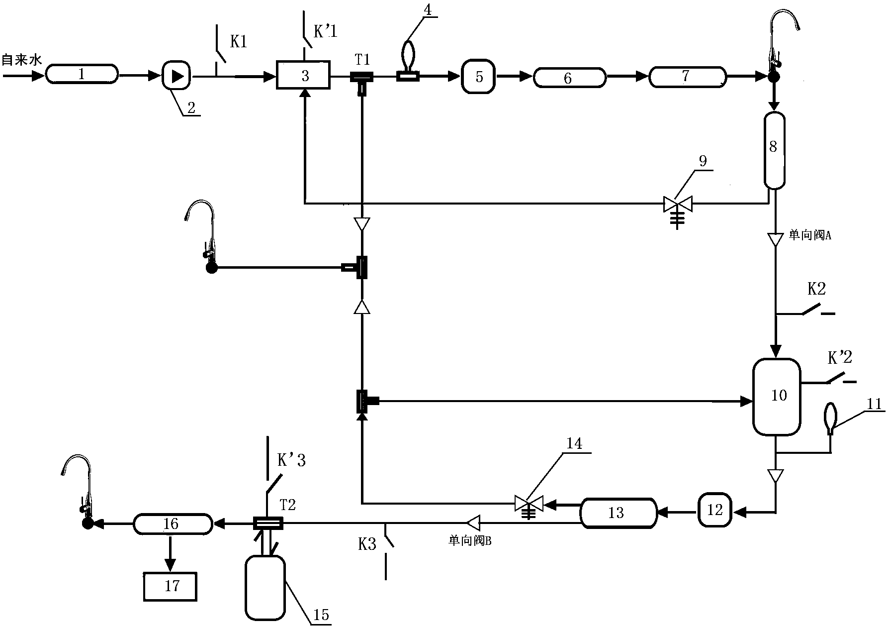 5.根據權利要求1所述的雙梯級雙循環RO無廢水凈水機,其特征在于:所述的四通閥(T2)還與壓力桶(16)和第三高壓開關(K’3)相連。