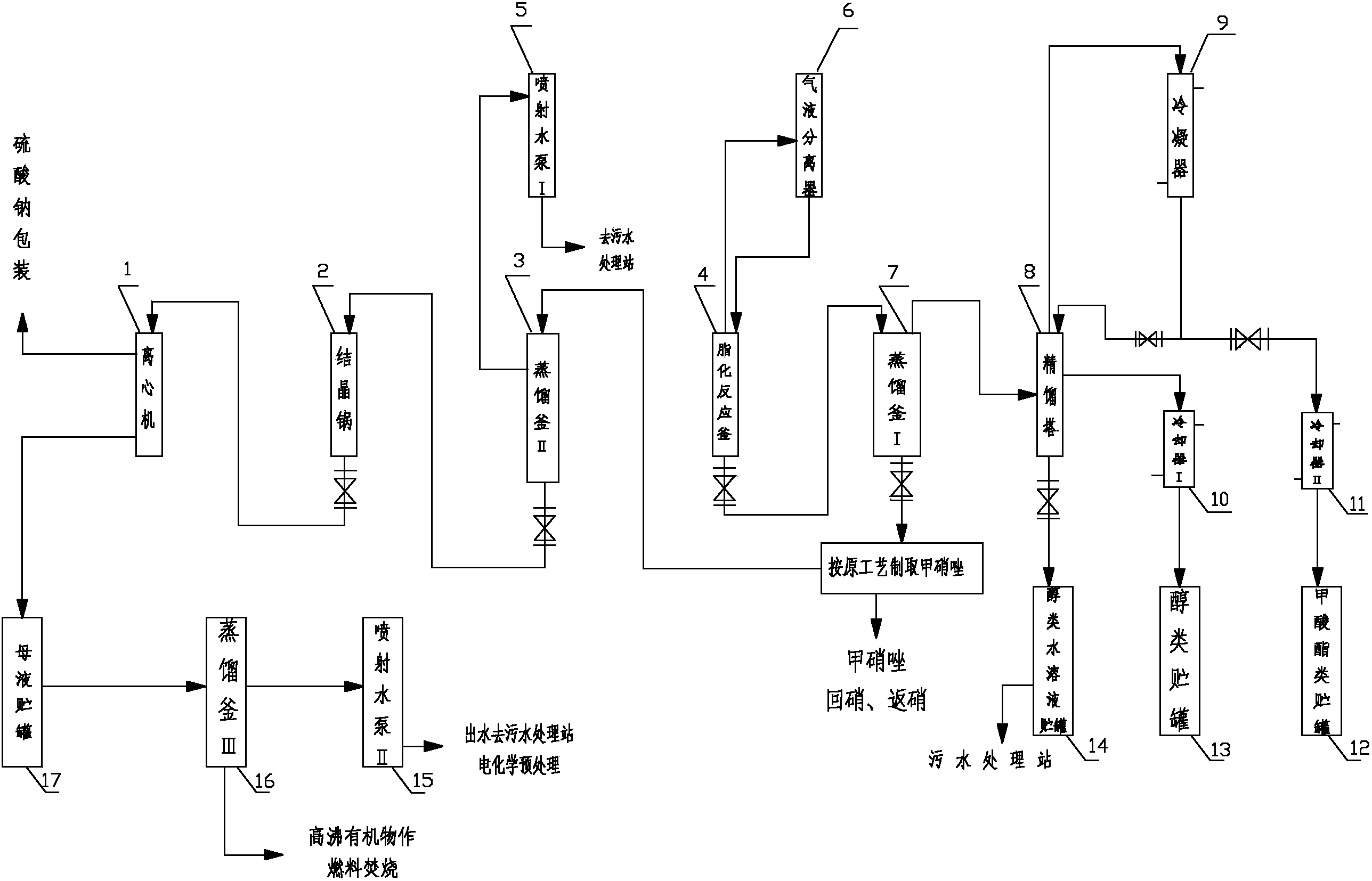 2.一種綜合利用甲硝唑羥化合成廢水生產(chǎn)甲酸甲酯或甲酸乙酯方法的裝 置,包括酯化反應(yīng)釜(4)、氣液分離器(6)、蒸餾釜Ⅰ(7)、精餾塔(8)、 冷凝器(9)、冷卻器Ⅰ(10)、冷卻器Ⅱ(11)、甲酸酯類貯罐(12)、醇 類貯罐(13)、醇類水溶液貯罐(14)、蒸餾釜Ⅱ(3)、噴射水泵Ⅰ(5)、 結(jié)晶鍋(2)、離心機(jī)(1)、母液貯罐(17)、蒸餾釜Ⅲ(16)和噴射水泵 Ⅱ(15),其特征在于:所述氣液分離器(6)的進(jìn)料口和出料口與酯化反應(yīng) 釜(4)連接;所述酯化反應(yīng)釜(4)的出料口與蒸餾釜Ⅰ(7)的進(jìn)料口連接; 所述蒸餾釜Ⅰ(7)的餾分蒸氣出口與精餾塔(8)的氣體進(jìn)口連接,所述精 餾塔(8)的塔頂氣體出口與冷凝器(9)的進(jìn)口連接,所述冷凝器(9)的出 口通過帶閥門的三通分別與冷卻器Ⅱ(11)的進(jìn)料口和精餾塔(8)的液體進(jìn) 口連接,所述精餾塔(8)的塔中出口與冷卻器Ⅰ(10)的進(jìn)料口連接,所述 精餾塔(8)的塔底液體出口與醇類水溶液貯罐(14)進(jìn)口連接,所述冷卻器 Ⅰ(10)和冷卻器Ⅱ(11)的出口分別與醇類貯罐(13)和甲酸酯類貯罐(12) 進(jìn)口連接;所述蒸餾釜Ⅰ(7)的釜底液體物料按原工藝制取甲硝唑后送入蒸 餾釜Ⅱ(3)中,所述蒸餾釜Ⅱ(3)的蒸氣出口與噴射水泵Ⅰ(5)連接,所 述蒸餾釜Ⅱ(3)釜底物料出口與結(jié)晶鍋(2)的進(jìn)料口連接,所述結(jié)晶鍋(2) 的液體出口與離心機(jī)(1)的進(jìn)料口連接,所述離心機(jī)(1)的液體出料口與 母液貯罐(17)的進(jìn)料口連接,所述母液貯罐(17)的出口與蒸餾釜Ⅲ(16) 的進(jìn)料口連接,所述蒸餾釜Ⅲ(16)的蒸氣出口與噴射水泵Ⅱ(15)連接。