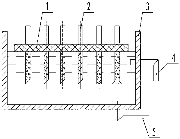 為了實現(xiàn)上述目的,本實用新型采用以下技術方案:它包括廢水處理池;廢水處理池中有漂浮板,該漂浮板上固定有若干向下伸入廢水處理池中的加料管,各加料管位于漂浮板以下的部位分布有若干小孔。