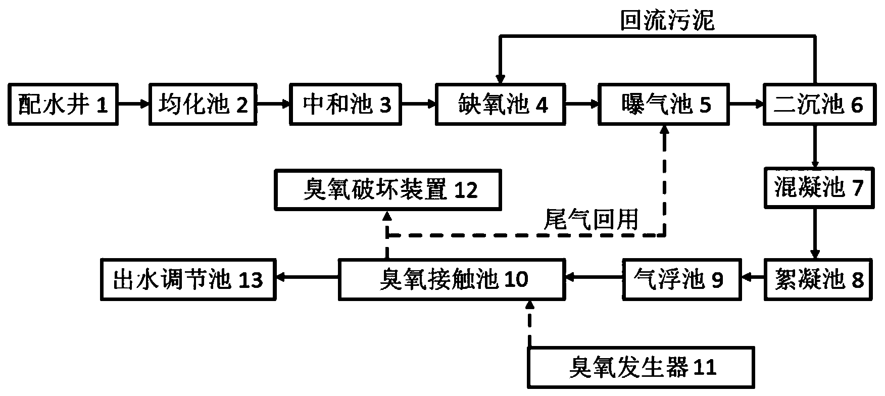 7.一種化工廢水的凈化處理裝置,含有污水泵和配水井(1)、預處理單元、生化處理單元、物化處理單元、臭氧處理單元和出水調節單元,適合處理來自石化工業企業水質波動大、毒性高、色度來源復雜的化工廢水,其特征在于,所述預處理單元包括均化池(2)和中和池(3)、所述生化處理單元包括缺氧池(4)、曝氣池(5)和二沉池(6)、所述物化處理單元包括混凝池(7)、絮凝池(8)和氣浮池(9)、所述臭氧處理單元包括臭氧接觸池(10)以及臭氧發生器(11)和臭氧破壞裝置(12)、所述出水調節單元含有出水調節池(13);所述化工廢水經配水井(1)和污水泵提升至均化池(2),然后依次經過中和池(3)、缺氧池(4)、曝氣池(5)、二沉池(6)、混凝池(7)、絮凝池(8)和氣浮池(9)、臭氧接觸池(10),最后經出水調節池(13)調節后排放。