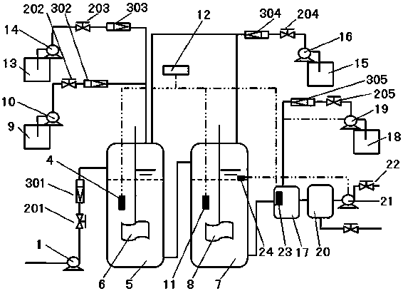 所述第二氣升式反應器(7)的下端通過管道與調節池(17)連接,所述堿液儲罐(18)與加堿泵(19)連接并通過管道串接第五閥門(205)和第五流量計(305)后與所述調節池(17)連接;