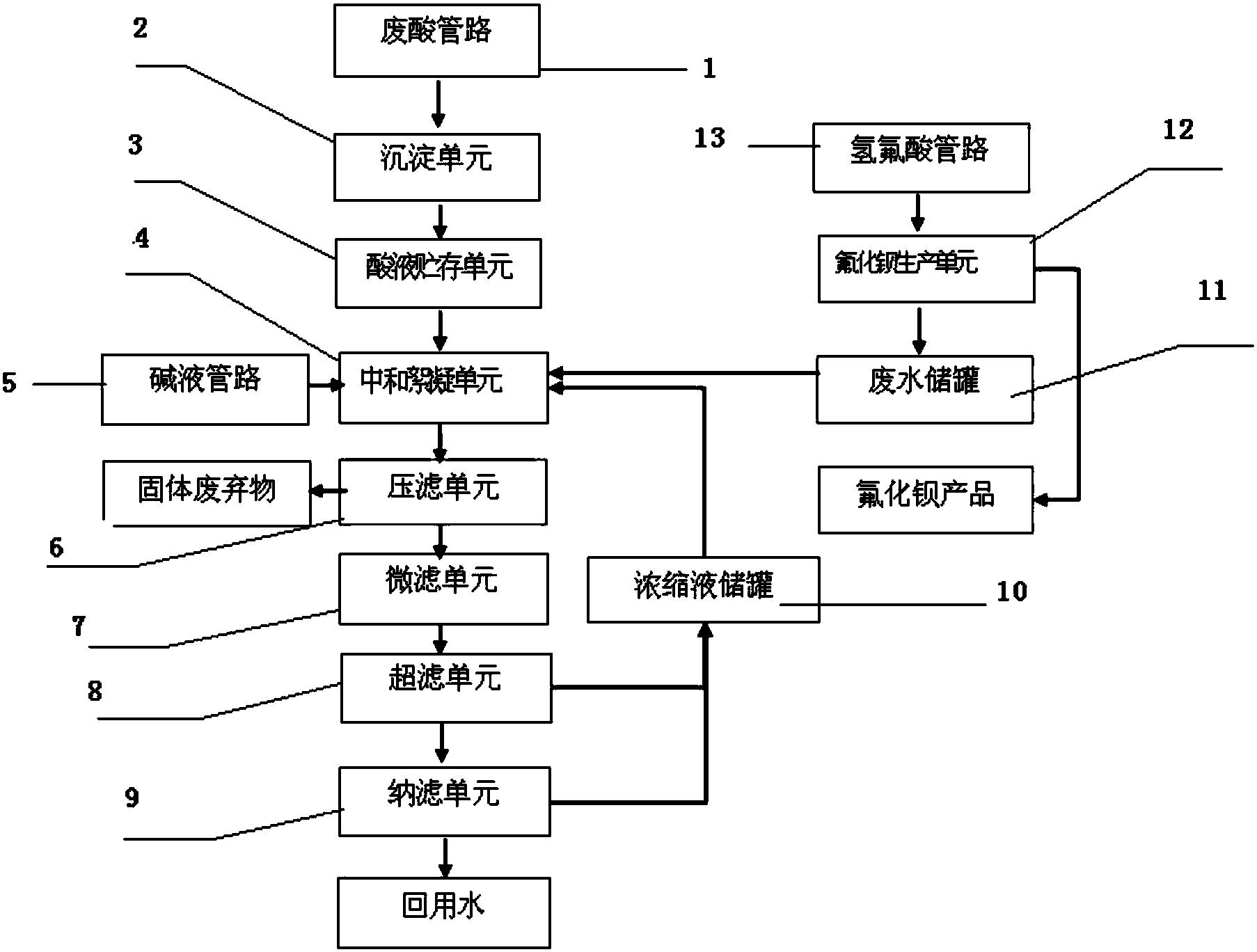 沉淀單元、酸液貯存單元、中和絮凝單元、壓濾單元、微濾單元、超濾單元、納濾單元依次相連通;堿液管路與中和絮凝單元相連通;氫氟酸管路、氟化鋇生產(chǎn)單元、廢水儲(chǔ)罐依次相連通;濃縮液儲(chǔ)罐與超濾單元、納濾單元、中和絮凝單元相連通。