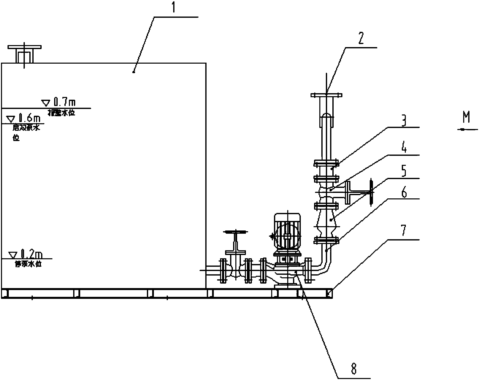 接于箱體出水口的并聯(lián)管路(2),該并聯(lián)管路中并行的兩條管路均依次安裝有排污泵(8)、短管組件I(6)、球形止回閥(5)、閘閥(4)、軟接頭(3),該并聯(lián)管路匯接于出口;