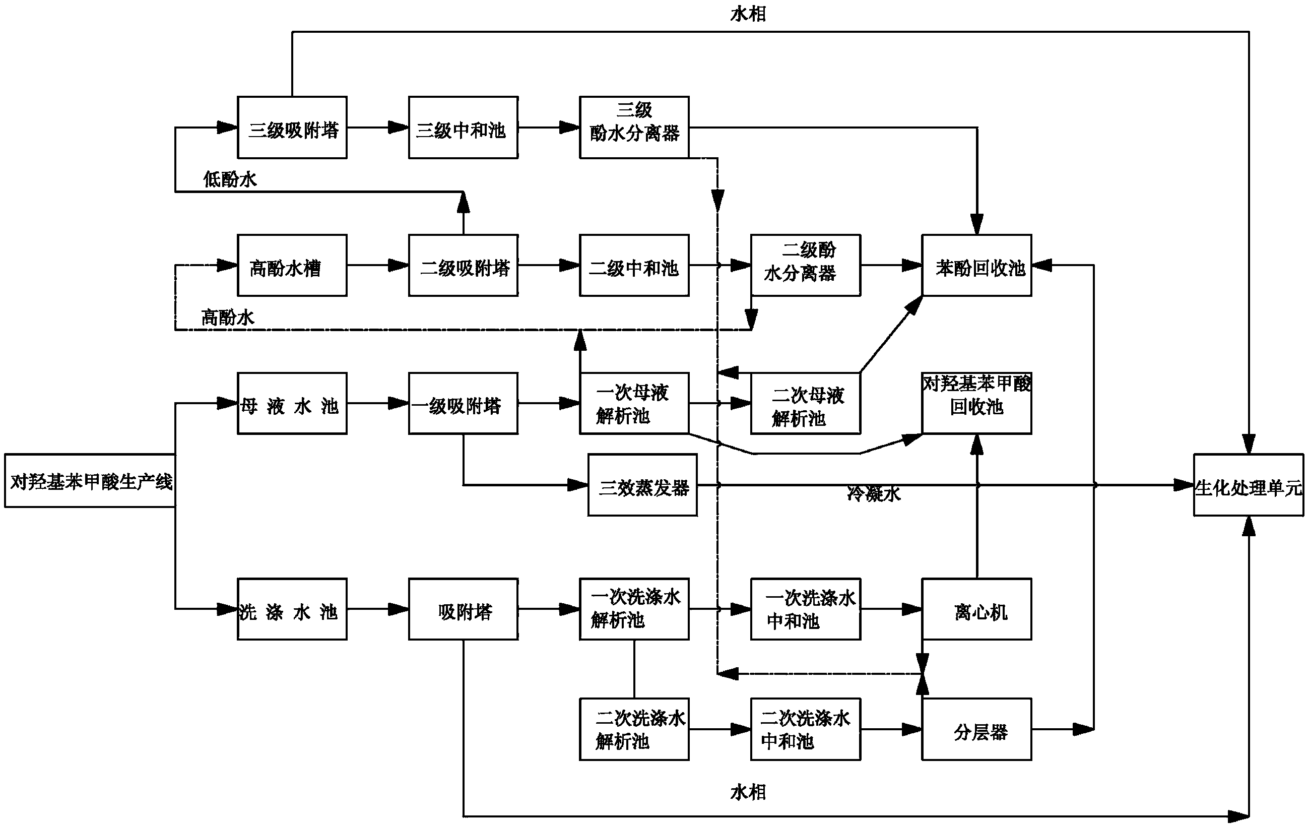 上述洗滌水處理單元包括吸附塔、由上述吸附塔分為兩路,一路通過管道直接與生化處理單元相連;另一路包括依次連接的一次洗滌水解析池、一次洗滌水中和池、離心機、對羥基苯甲酸回收池相連,上述一次洗滌水解析池還通過支路依次連接二次洗滌水解析池、二次洗滌水中和池、分層器、苯酚回收池。