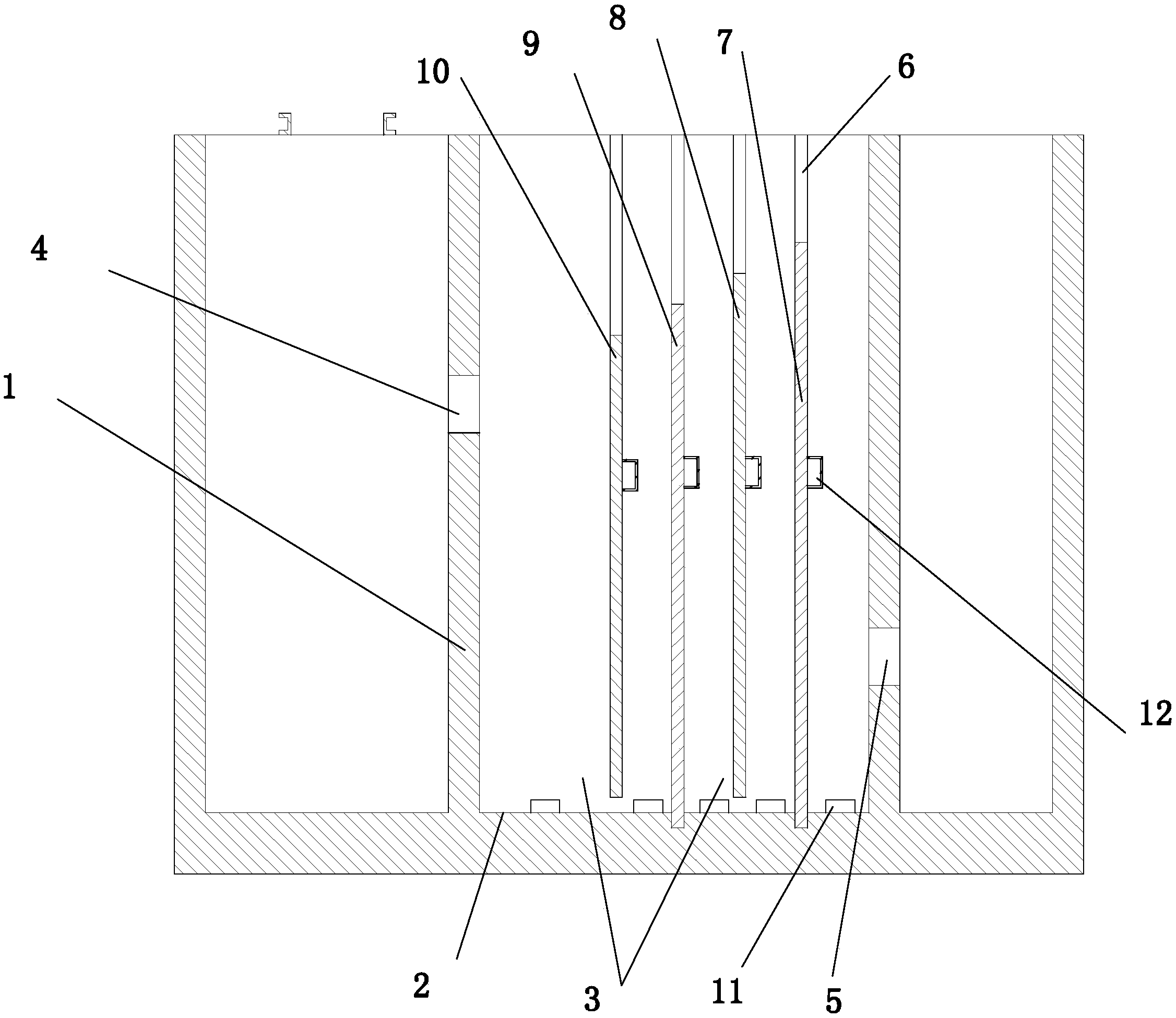 本實用新型進一步設置為:所述U型流道由擋流板構成,池體上設有凹槽,擋流板安裝在池體的凹槽上,擋流板和池底之間間隔設有供污水流通的通道,擋流板高度沿液流方向依次下降。