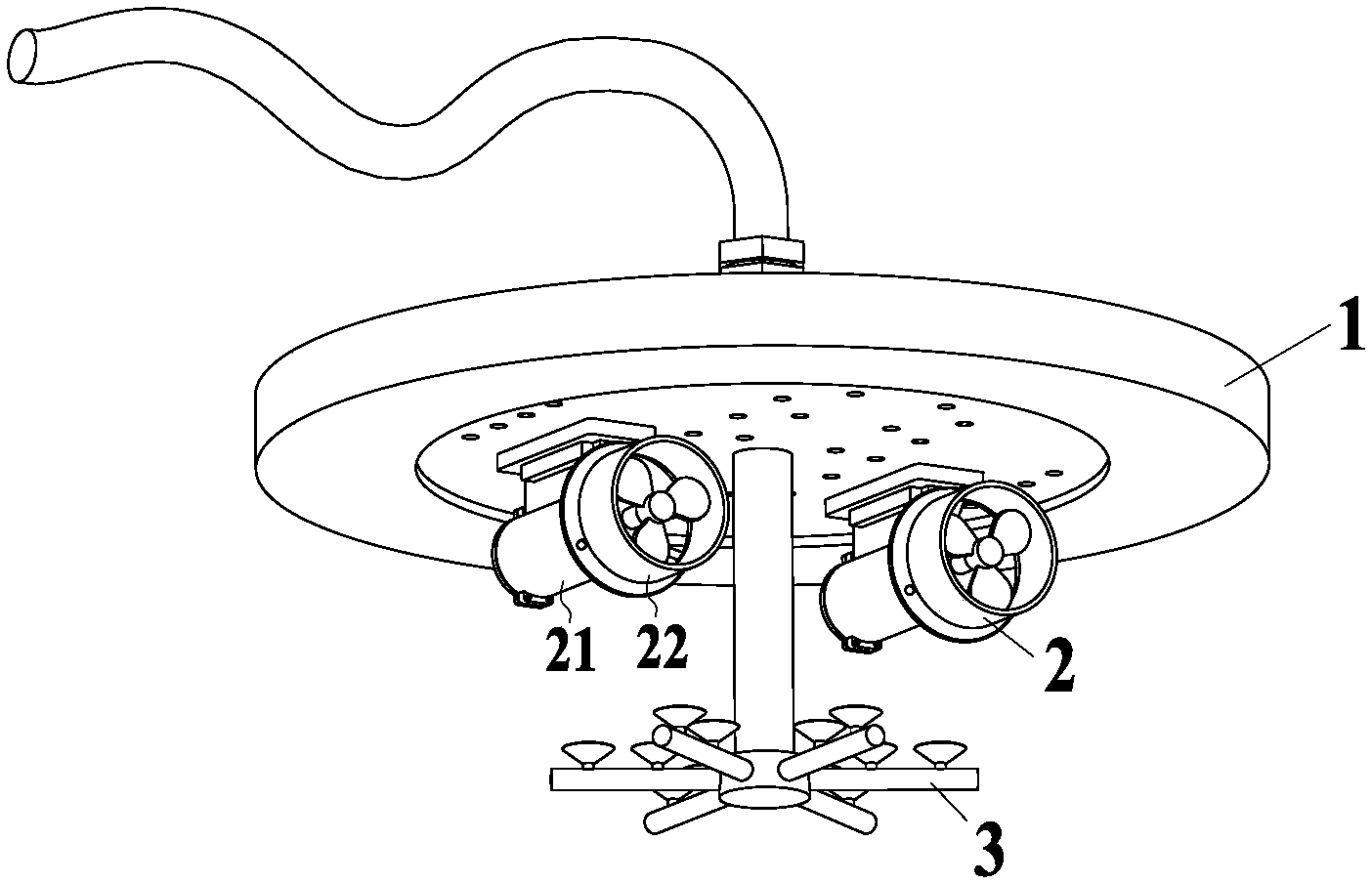 2.根據(jù)權(quán)利要求1中所述的一種用于污水處理的推進式曝氣設(shè)備,其特征在于:所述 的推進裝置(2)包括直流無刷電機(21)和螺旋槳(22),所述的直流無刷電機(21)與螺旋槳 (22)均有一對,且一對直流無刷電機(21)對稱安裝在所述內(nèi)漂浮圈(11)下端面兩側(cè),且所 述的一對螺旋槳(22)分別安裝在一對直流無刷電機(21)端部。