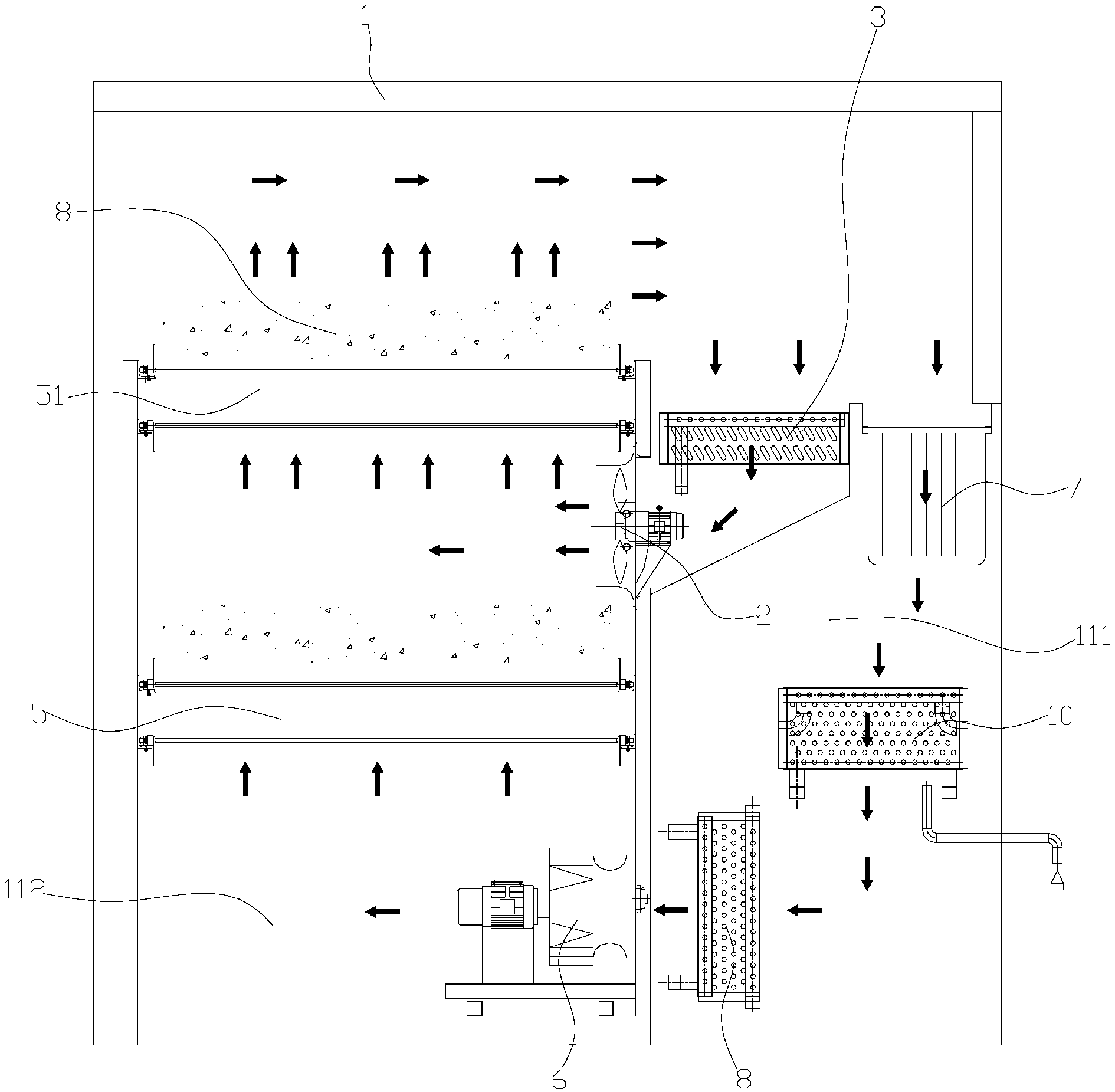 優選的,所述功能區中還安裝有回熱器,空氣通過回熱器熱側后通過冷卻器進行熱交換,然后通過回熱器冷側后與二級加熱器進行加熱,然后通過送風機進入污泥干燥區用于干燥。