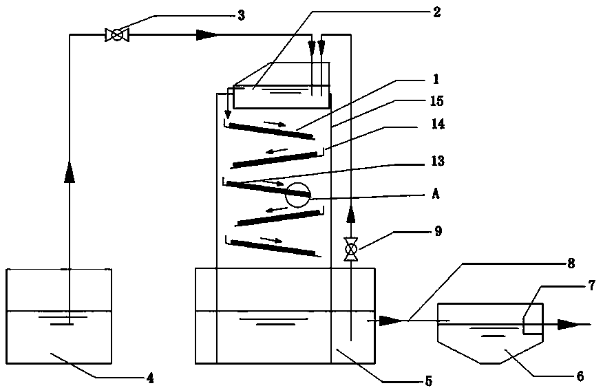 1.一種基于填料和折疊板的廢水生物膜反應器,其特征在于:包括進水池(4)、布水槽(2)、供廢水流經的重力導流裝置、循環水池(5)、沉淀池(6)、用于支撐所述布水槽(2)和重力導流裝置的支架(15),所述布水槽(2)通過管道及進水泵(3)連接進水池(4),布水槽(2)出水口處設置有齒狀溢流槽,所述重力導流裝置設置于布水槽(2)下方,包括在豎直方向上相隔一定間距層疊排布且各自傾斜一定角度的若干折疊板(1),相鄰兩塊折疊板(1)的傾斜方向相反,所述折疊板(1)的上表面粘結有生物親和性填料(13),布水槽(2)內的廢水沿所述折疊板(1)由上向下呈折線形逐板流過落入位于重力導流裝置下方的循環水池(5)內,所述循環水池(5)通過管道和循環泵(9)連接布水槽(2),同時還通過具有閘閥的連接管(8)連接帶有出水口的沉淀池(6)。