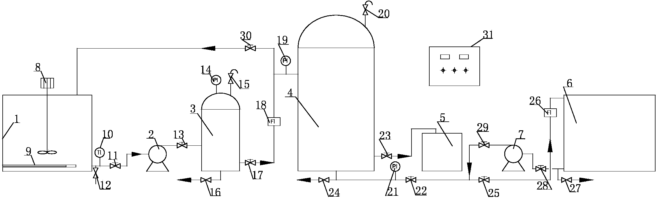 1.一種石油水處理精細過濾裝置,包括電控柜(31)、進料箱(1)、 提升泵(2)、濾袋過濾器(3)和濾芯精密過濾器(4),其特征在于: 所述進料箱(1)內污水通過提升泵(2)提升到濾袋過濾器(3)內, 濾袋過濾器(3)與濾芯精密過濾器(4)通過管道相連接,經濾芯精 密過濾器(4)的油污流入到與濾芯精密過濾器(4)相連的污油桶(5) 內,經濾芯精密過濾器(4)的干凈水注入到凈水箱(6)內,反洗泵 (7)的輸出端連接在濾芯精密過濾器(4)的底部,反洗泵(7)的 輸入端連接凈水箱(6)。