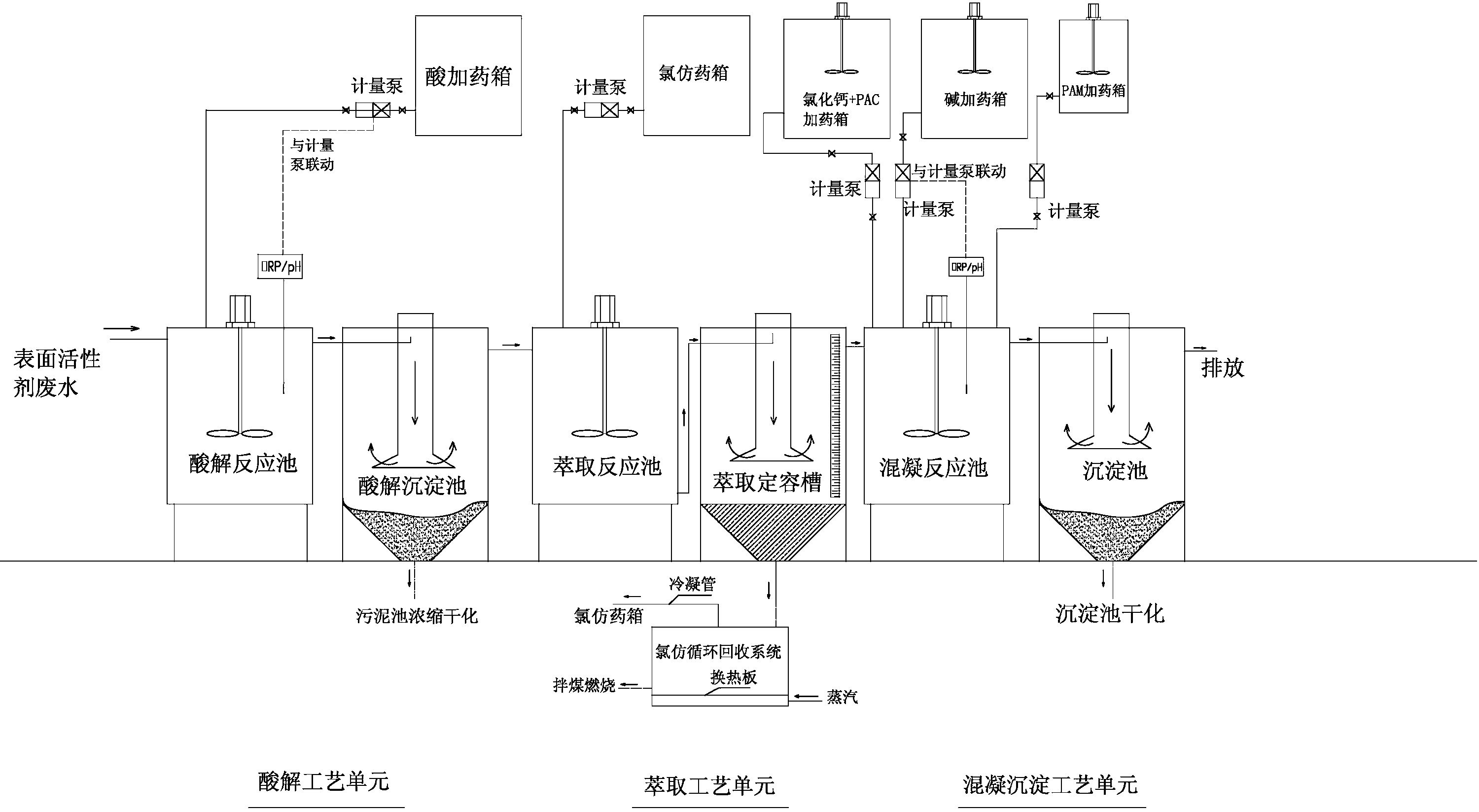 1)酸解:在攪拌表面活性劑廢水的同時加入硫酸進行混合,調節該廢水的pH值1-2,靜置沉淀1.5-2h,取上清液;