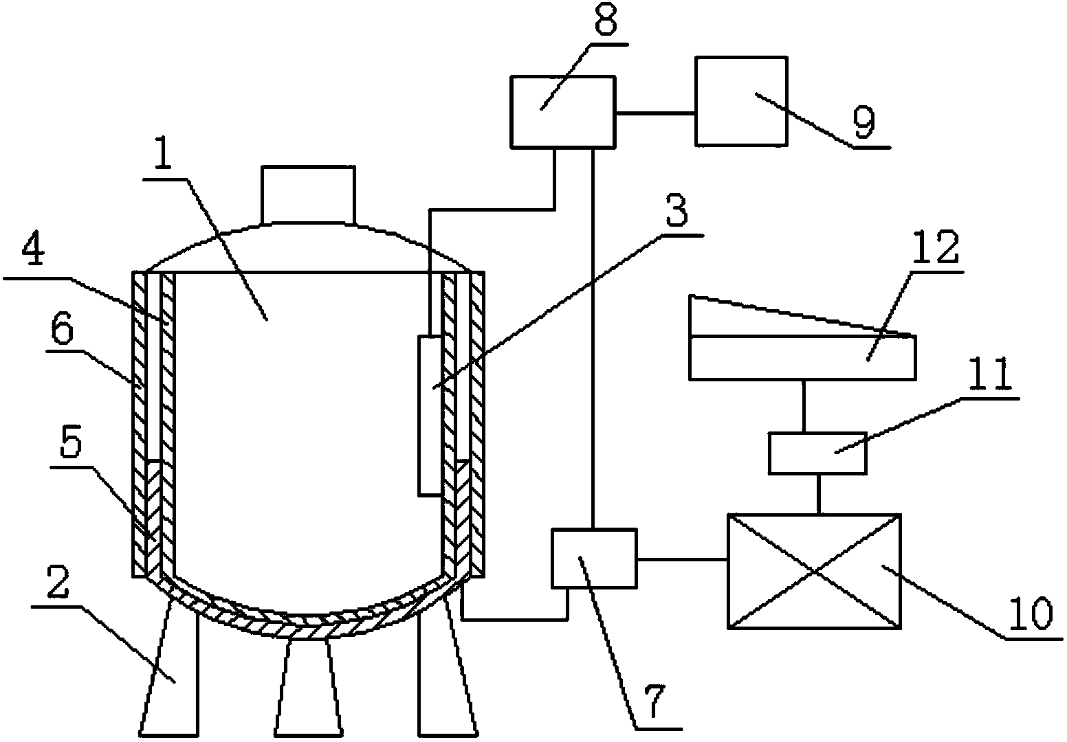 本實(shí)用新型一種生產(chǎn)水處理劑用反應(yīng)釜的有益效果是:使用時(shí),通過(guò)所設(shè) 的溫度檢測(cè)裝置檢測(cè)反應(yīng)釜內(nèi)部溫度,并將溫度信息通過(guò)顯示屏告知使用者,使用者通過(guò)控制加熱裝置控制箱來(lái)實(shí)現(xiàn)其加熱,當(dāng)溫度過(guò)高時(shí),報(bào)警裝置會(huì)啟 動(dòng),從而告知使用者,通過(guò)所設(shè)的耐磨層,可增加其使用壽命,通過(guò)所設(shè)的保 溫層,可防止其溫度流失,減少了資源的浪費(fèi),通過(guò)所設(shè)的太陽(yáng)能電池板,可將太陽(yáng)能裝變成電能儲(chǔ)存在電源存儲(chǔ)裝置內(nèi),以供反應(yīng)釜所需用電。其結(jié)構(gòu)簡(jiǎn)單,使用、安裝方便,操作簡(jiǎn)單,溫控效果好,反應(yīng)效果好,生產(chǎn)質(zhì)量高,生產(chǎn)效率高,適用范圍廣,節(jié)能環(huán)保,具有安全可靠的作用。