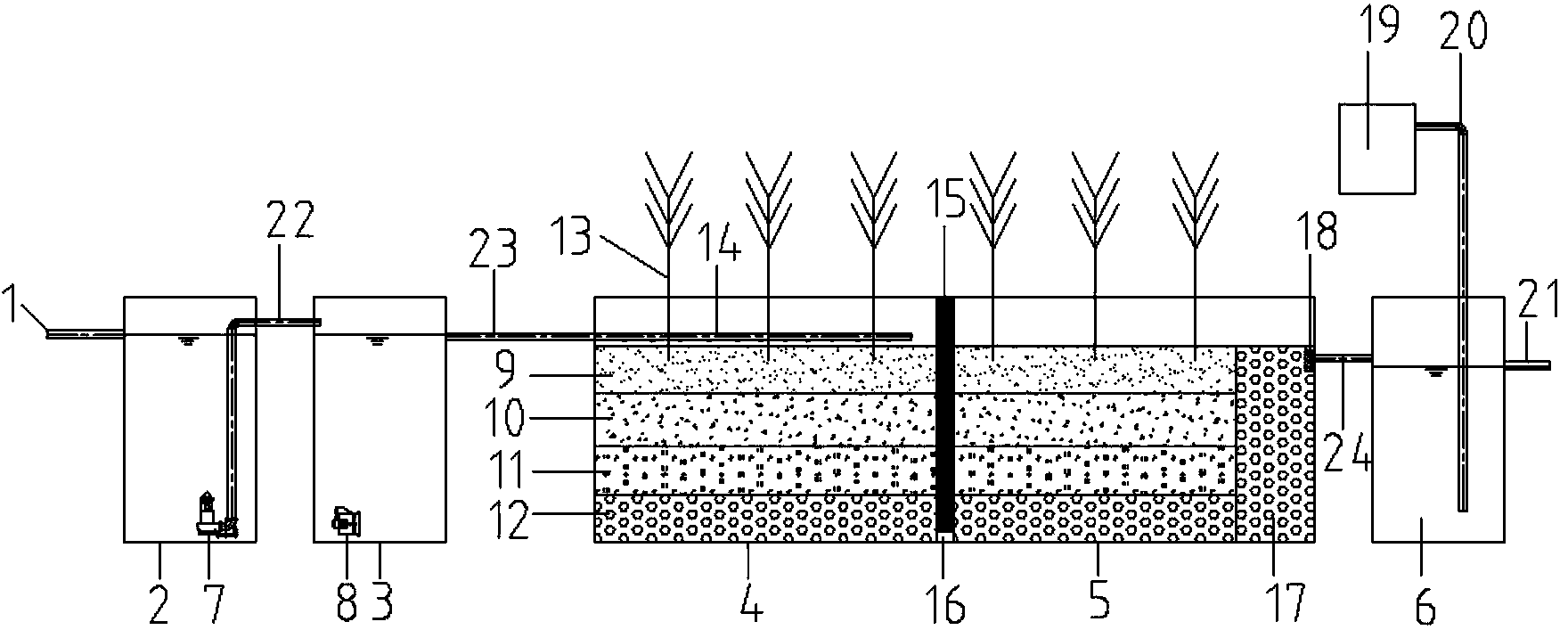 1.一種用于海水養殖廢水處理的人工濕地系統,其主要包括原水管(1)、調節池(2)、 酸化水解池(3)、濕地區域、出水池(6),其特征在于:所述原水管(1)連接到所述 調節池(2)內,所述調節池(2)通過水管Ⅰ(22)與所述酸化水解池(3)對應連接, 所述酸化水解池(3)通過水管Ⅱ(23)連接濕地區域,濕地區域后連接出水碎石層(17), 所述出水碎石層(17)通過水管Ⅲ(24)與所述出水池(6)對應連接,所述出水池(6) 上連有可添加消毒藥劑(19)的消毒管道(20),濕地區域設有四個填料層,從上到下 依次是土壤層(9)、礫石層(10)、牡蠣殼(11)、碎石層(12),濕地區域中間設有一 道隔離墻(15)將濕地區域分隔成下行流濕地區域(4)和上行流濕地區域(5)兩個區 域,所述的隔離墻(15)下設有過水孔(16),所述下行流濕地區域(4)上設有布水管 (14)。