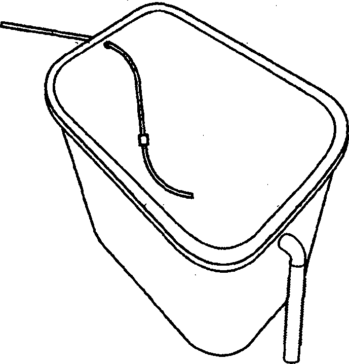 1.凈水器廢水回收利用水桶,為長方體水桶,也可以是圓桶或方桶,其特征是,所述水桶一邊上沿處有小孔,凈水器廢水水管可以插進來,水桶內壁有一個廢水管的小卡口,凈水器廢水水管的水流入水桶內,水桶的另一邊,有一個廢水出水口,低于凈水器廢水水管插入口的高度,出水口處有帶小孔的過濾網,出水口連接出水彎頭,出水彎頭又連接可伸縮的廢水軟管,廢水積滿水桶,到達廢水出水口時,水流到出水彎頭,然后流入可伸縮的廢水軟管,最后流入下水道。