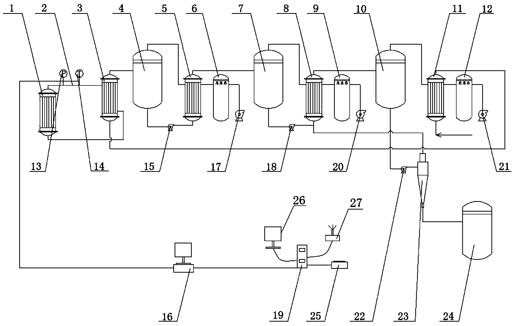 所述第一換熱器(1)的出口通過絕熱導管(2)與第二換熱器(3)的換熱管進口相連, 所述第一換熱器(1)的進口與第二換熱器(3)的換熱管出口也通過絕熱導管(2)相連,所 述第二換熱器(3)的出口與第一蒸發(fā)器(4)的料液進口相連,所述第一蒸發(fā)器(4)的二次 蒸汽出口與第三換熱器(5)的換熱管進口相連,所述第一蒸發(fā)器(4)的完成液出口經(jīng)過第 一循環(huán)泵(15)后連接至第三換熱器(5)的進口,所述第三換熱器(5)的換熱管出口與第 一冷凝器(6)的進口相連,所述第一冷凝器(6)的不凝性氣體出口與第一真空泵(17)相 連,所述第三換熱器(5)的出口與第二蒸發(fā)器(7)的料液進口相連,所述第二蒸發(fā)器(7) 的二次蒸汽出口與第四換熱器(8)的換熱管進口相連,所述第二蒸發(fā)器(7)的完成液出口 經(jīng)過第二循環(huán)泵(18)后連接至第四換熱器(8)的進口,所述第四換熱器(8)的換熱管出 口與第二冷凝器(9)的進口相連,所述第二冷凝器(9)的不凝性氣體出口與第二真空泵(20) 相連,所述第四換熱器(8)的出口與結晶器(10)的料液進口相連,所述結晶器(10)的二 次蒸汽出口與第五換熱器(11)的換熱管進口相連,所述結晶器(10)的完成液出口經(jīng)過第 三循環(huán)泵(22)后連接至旋流器(23)的進料口,所述旋流器(23)的溢流口與第四換熱器 (8)的進口相連,所述第五換熱器(11)的換熱管出口與第三冷凝器(12)的進口相連,所 述第五換熱器(11)的進口用于與含鹽廢水調(diào)節(jié)罐相連,所述第五換熱器(11)的出口與第 二換熱器(3)進口相連,所述第三冷凝器(12)的不凝性氣體出口與第三真空泵(21)相連, 所述旋流器(23)的出料口與重結晶提純裝置(24)的進口相連;