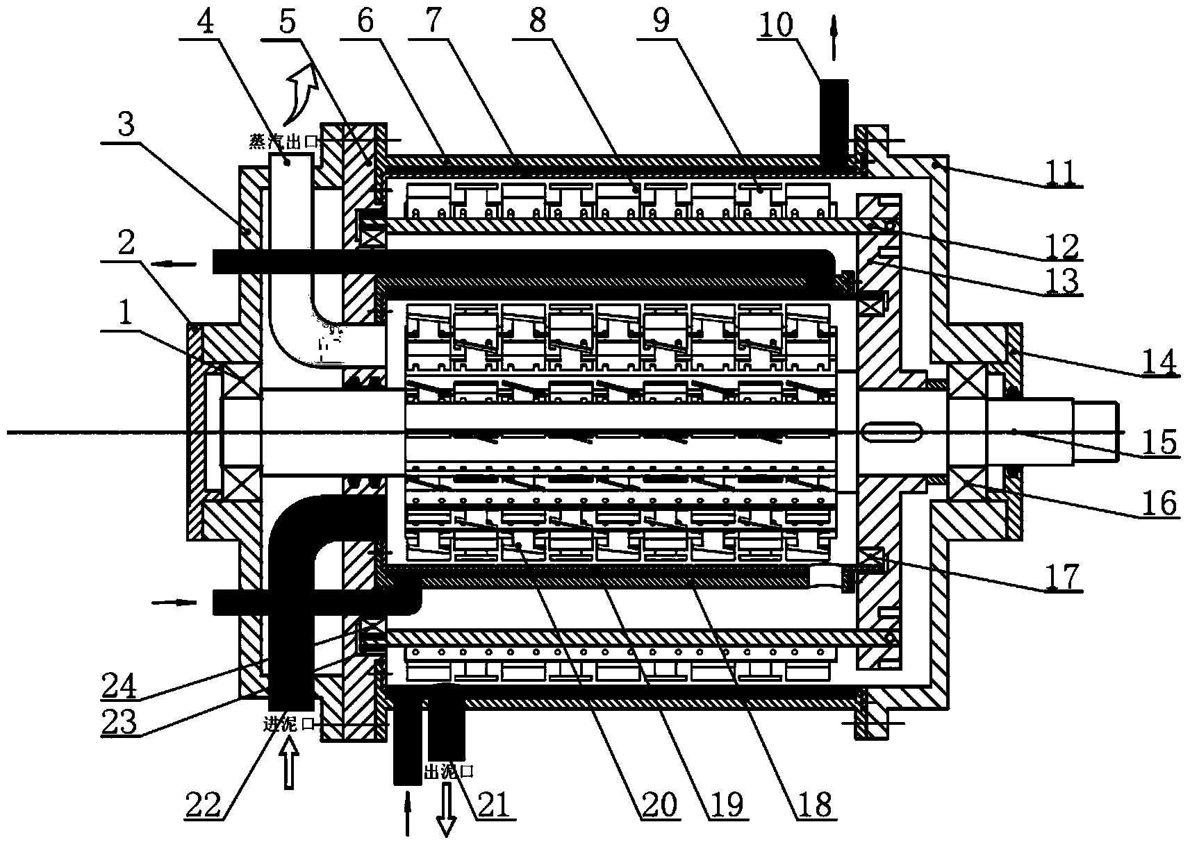 1.一種臥式同心雙層污泥薄層干化設(shè)備,其特征是:該設(shè)備由左軸承(1)、左軸承蓋 (2)、左端蓋(3)、蒸汽管(4)、支撐壁(5)、外蒸發(fā)筒外筒(6)、外蒸發(fā)筒內(nèi)筒 (7)、水平刮板(8)、傾斜刮板A(9)、導(dǎo)熱油管(10)、右端蓋(11)、刮板臂 (12)、轉(zhuǎn)壁(13)、右軸承蓋(14)、轉(zhuǎn)軸(15)、右軸承(16)、內(nèi)蒸發(fā)筒支撐軸承 (17)、內(nèi)蒸發(fā)筒外筒(18)、內(nèi)蒸發(fā)筒內(nèi)筒(19)、傾斜刮板B(20)、出泥管 (21)、進(jìn)泥管(22)、刮板臂約束環(huán)(23)、刮板臂支撐軸承(24)組成;