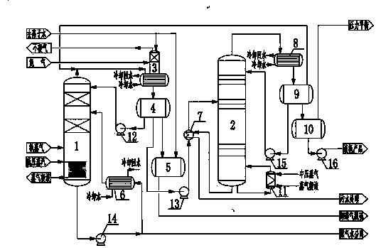 如上所述的煤氣化廢水處理裝置汽提脫氨塔來的粗氨氣溫度50~60℃,壓 力0.2~0.3MPa,質量組成為:NH387.0~91.0wt%,H2O 7.0~10.0wt%,H2S 0.4~0.8wt%,CO21.0~3.0wt%和油0.05~0.1wt%,酚3000~6000mg/m3。