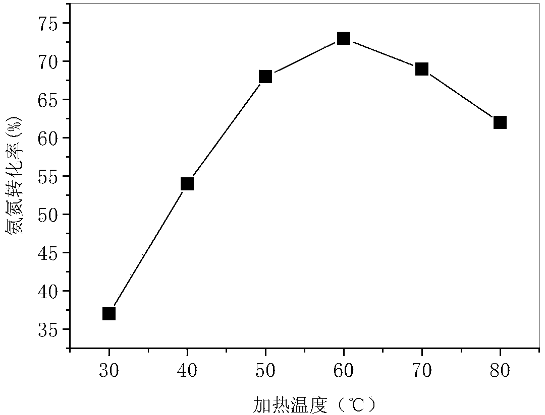 圖1顯示,隨著加熱溫度的升高,氨氮被催化轉化的效果越好。但過高的溫度下,由于 溶液中氧氣含量的降低反而導致氨氮被催化轉化的效果變差。
