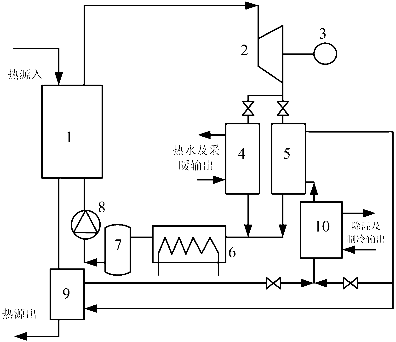 低熱度廢水的熱量在蒸汽發生器(1)中傳遞給動力循環工質,使之溫度上升變成蒸 汽;產生的工質蒸汽進入膨脹機(2),使之對外做功帶動發電機(3);通過切換閥門, 使膨脹機(2)的排氣進入熱水換熱器(4),實現熱水的制取,用于生活熱水或者采暖 輸出;或者使膨脹機(2)的排氣進入溶液加熱器(5),再進入溶液再熱器(9)中使溶 液溫度升高,之后進入溶液除濕空調機組(10)中驅動機組實現冷量的輸出。